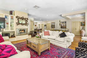 Cooking is a joy in the updated kitchen, where natural stone, hardwood surfaces, and contemporary cabinetry meet a European double wall oven and six-burner gas cooktop. Open-plan living areas include a family room, meals zone, formal dining with minibar, and an expansive lounge room featuring a natural gas log fire, perfect for relaxed everyday living or hosting friends. A dedicated office and library nook add extra flexibility.